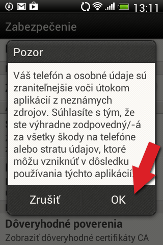 5. Potvrďte oznámenie, že akceptujete riziká spojené s inštaláciou aplikácií mimo známe zdroje Googleappstore.