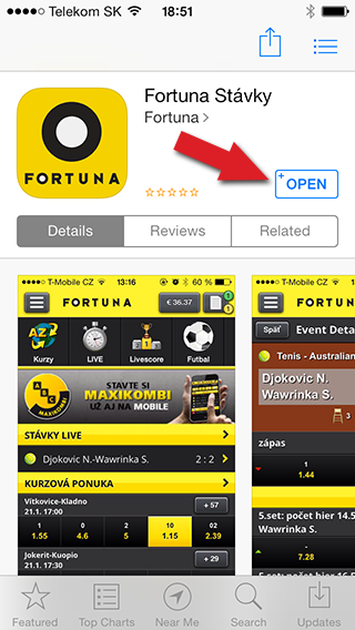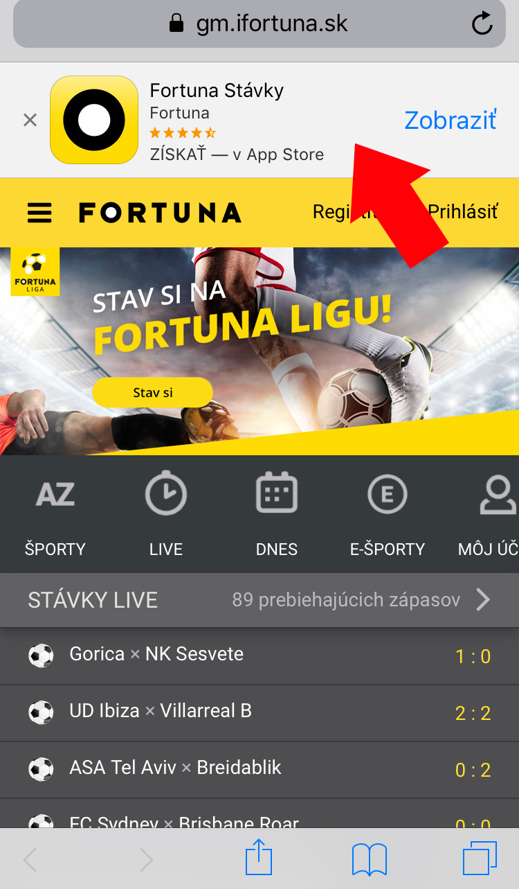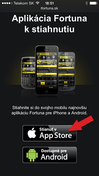 1. V mobilnom internetovom prehliadači si otvorte stránku http://m.ifortuna.sk/smartphone/aplikacia/ a tu kliknite na ikonku "Stiahnuť v App Store"