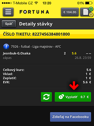 V prípade že je umožnená predčasná výplata tiketu zobrazí sa na dvoch miestach a je indikovaná zeleným talčidlom “Vyplatiť (suma) €”. Zelené tlačidlo so šípkami slúži na obnovenie aktuálnej ponúkanej sumy na vyplatenie. Predčasnú výplatu iniciujete dotykom na tlačidlo vyplatenia.