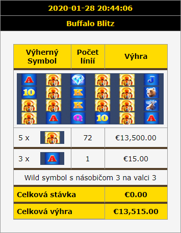 V utorok večer (28. 1.) padla v našom Casine skutočne veľká výhra. Na klienta sa usmialo šťastie, keď na svojom mobile stavil 10 eur na hru Buffalo Blitz a trafil 3-krát symbol Free Games. Získal tak 8 hier zdarma.